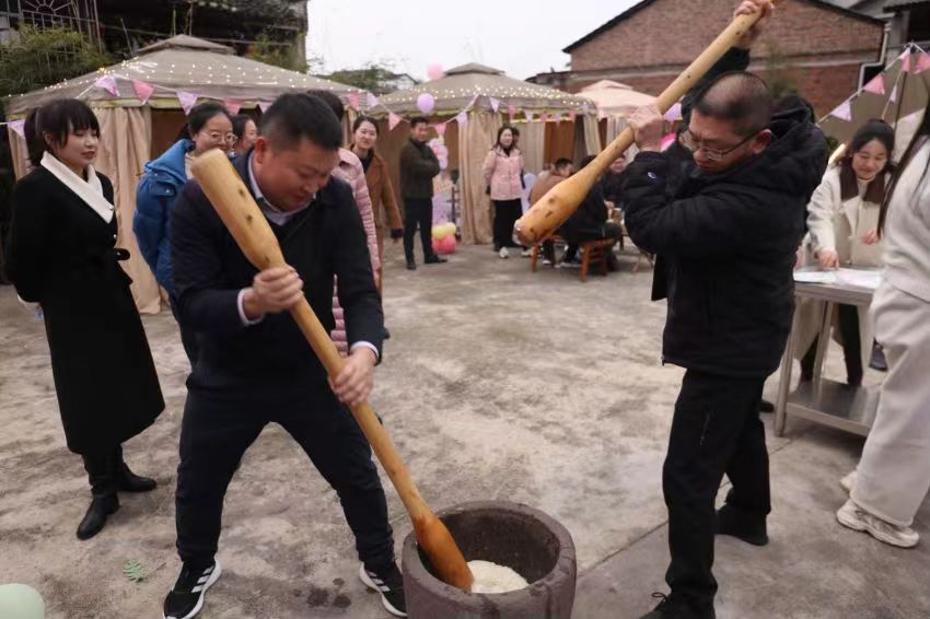 在“感受非遺之美”環節,員工們共同體驗了非遺活動——打糍粑,大家握緊竹棒輪流捶打糯米,親身體驗打糍粑的艱辛與樂趣。經過“單打”、“雙打”、“混合打”等多番合作,熱氣騰騰的糯米逐漸變成了一個個軟糯的糯米團。通過一起其樂融融的打糍粑活動,既增進了同事間的感情,又弘揚了優秀傳統文化。