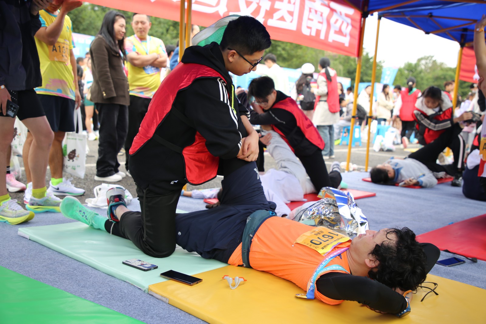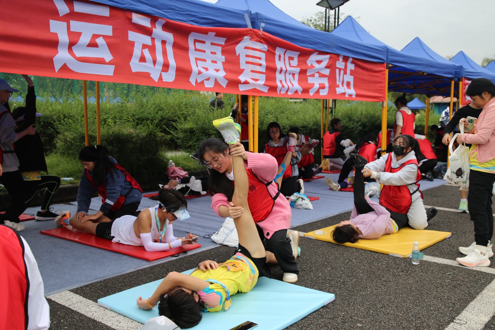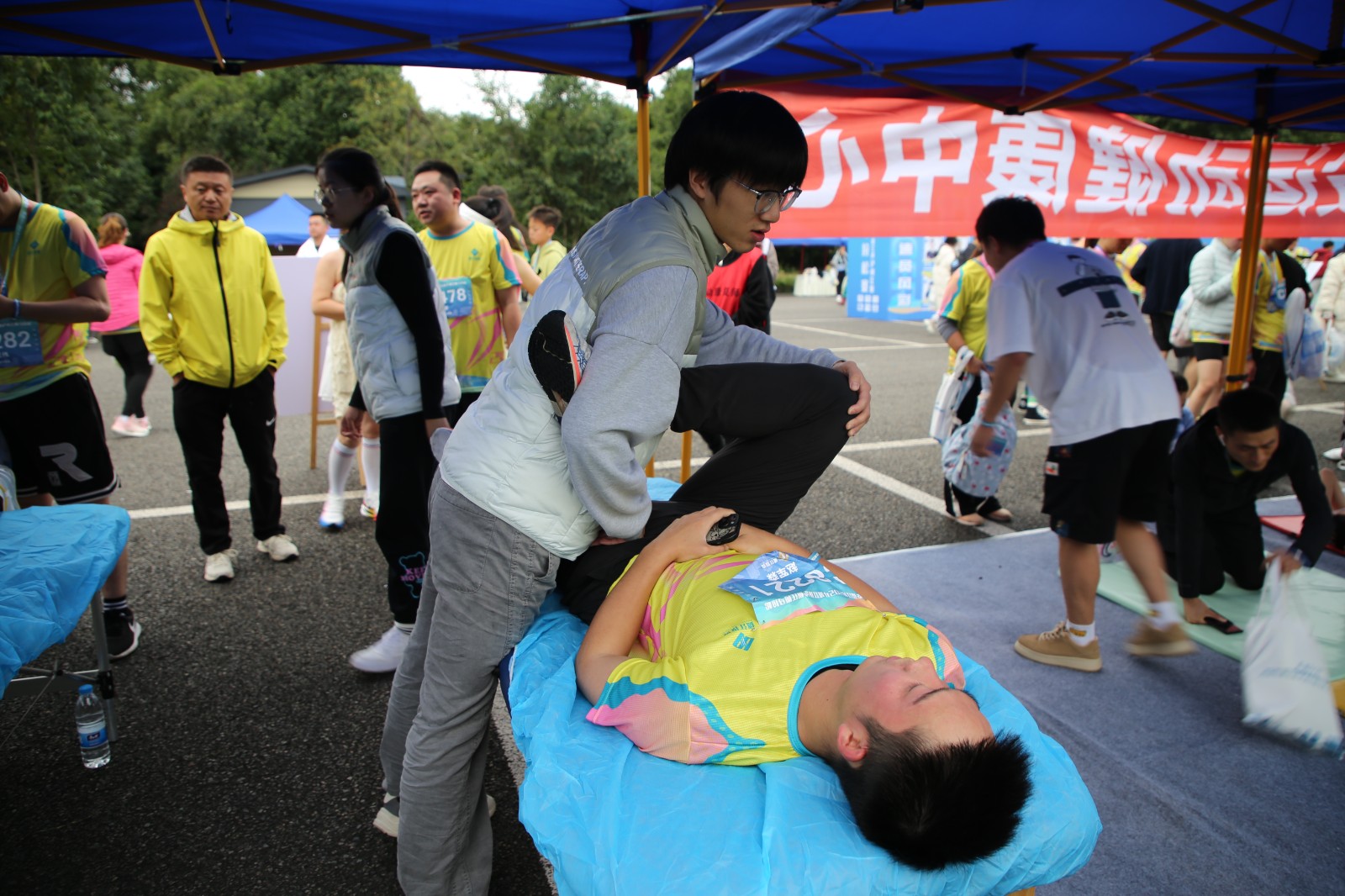 比賽前夕,運動健康中心提前布置現場,科學設置肌貼區、自由拉伸區、運動損傷康復區三個區域,時刻準備為參賽選手提供貼心服務。比賽階段,運動健康中心全程關注賽場狀況,第一時間為有需要的選手提供即時幫助與服務。其專業的指導與賽場服務得到了參賽選手的一致好評。此次馬拉松賽運動健康中心派出專業運動康復師6名,專業教練5名,志愿者30余名提供賽前肌貼、賽后拉伸、疼痛評估及康復服務等服務共計1500余人次